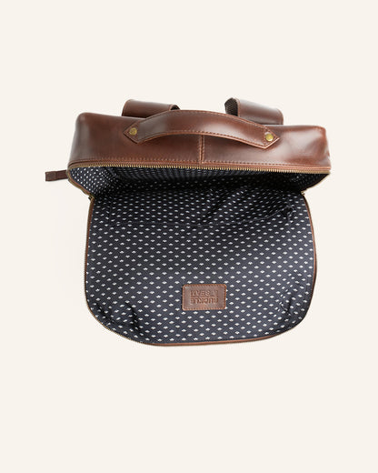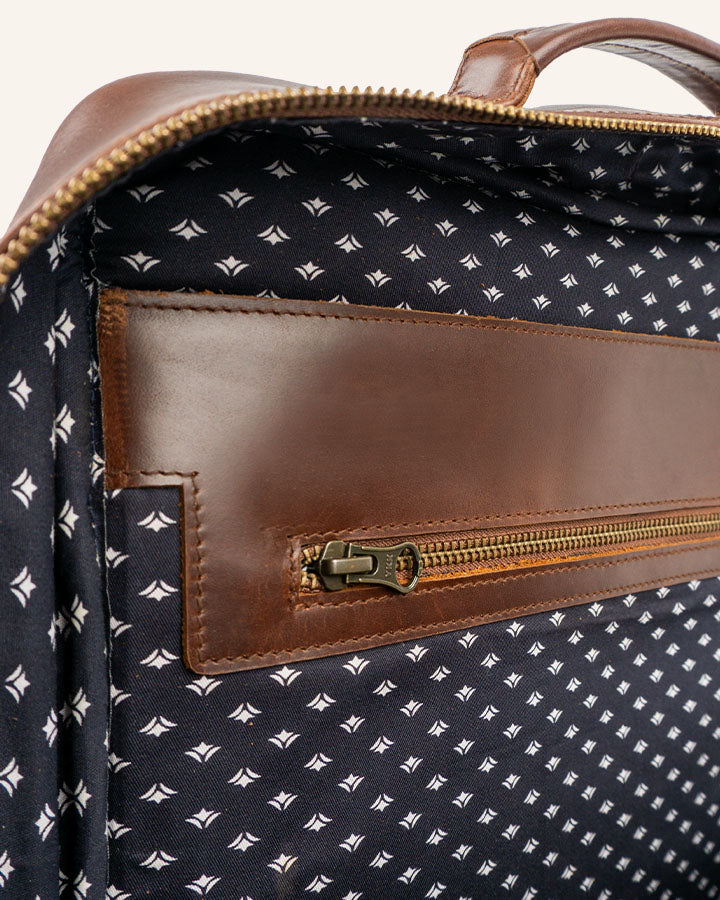Mik is the ideal leather backpack for everyday use, work, and travel. Its spacious main compartment with an integrated laptop sleeve (up to 16 inches) provides ample space for all essential items. Whether for the office, university, or on the go – this backpack combines style and functionality. A practical front pocket with a zipper allows quick access to frequently used items, while an internal compartment helps keep things organized and secure. Thanks to the smart trolley solution, Mik can be easily attached to a suitcase, making travel even more convenient.