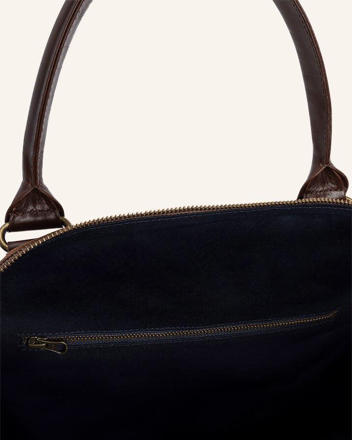 Leather develops a unique patina with frequent use, causing the leather to darken. However, over time, your bag may show signs of drying out, characterized by rougher and lighter leather. In such cases, we recommend using our leather care product to restore your bag to its